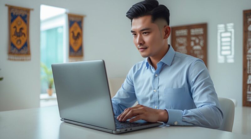 Seorang pria Indonesia menggunakan laptop di ruangan terang dengan hiasan batik, menunjukkan suasana aman dan nyaman untuk aktivitas online.