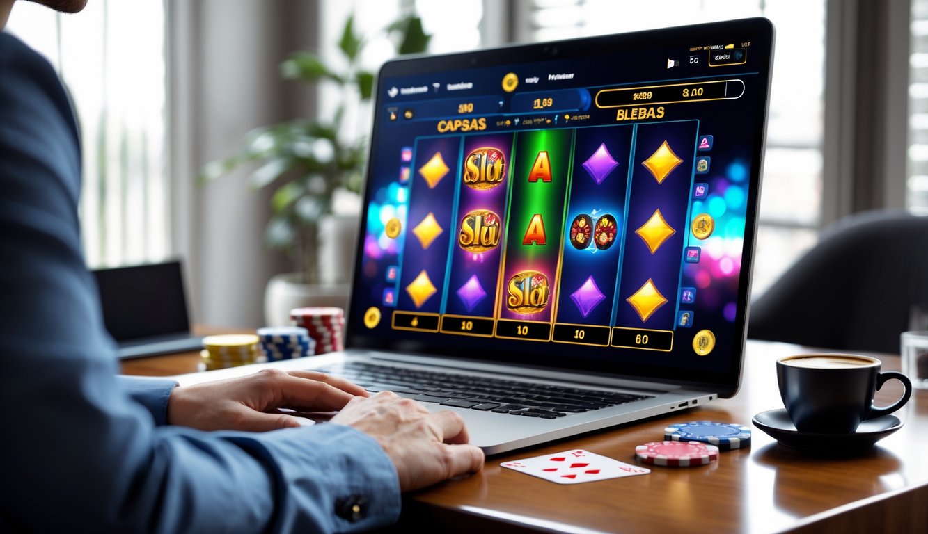Seorang pemain sedang menggunakan komputer dengan permainan slot capsas online yang berwarna-warni dan menarik di layar, di atas meja terdapat chip poker dan kartu remi.